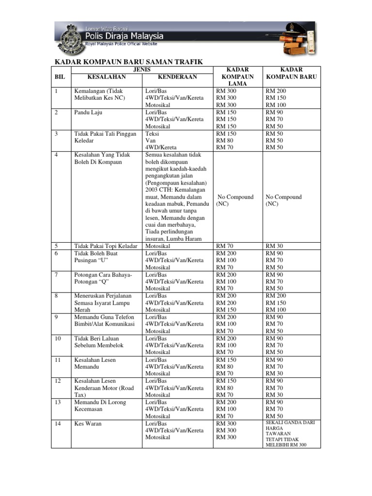 Kadar Saman Kesalahan Trafik Pdrm Motomalaya Net Berita Dan Ulasan Dunia Kereta Dan Motosikal Dari Malaysia